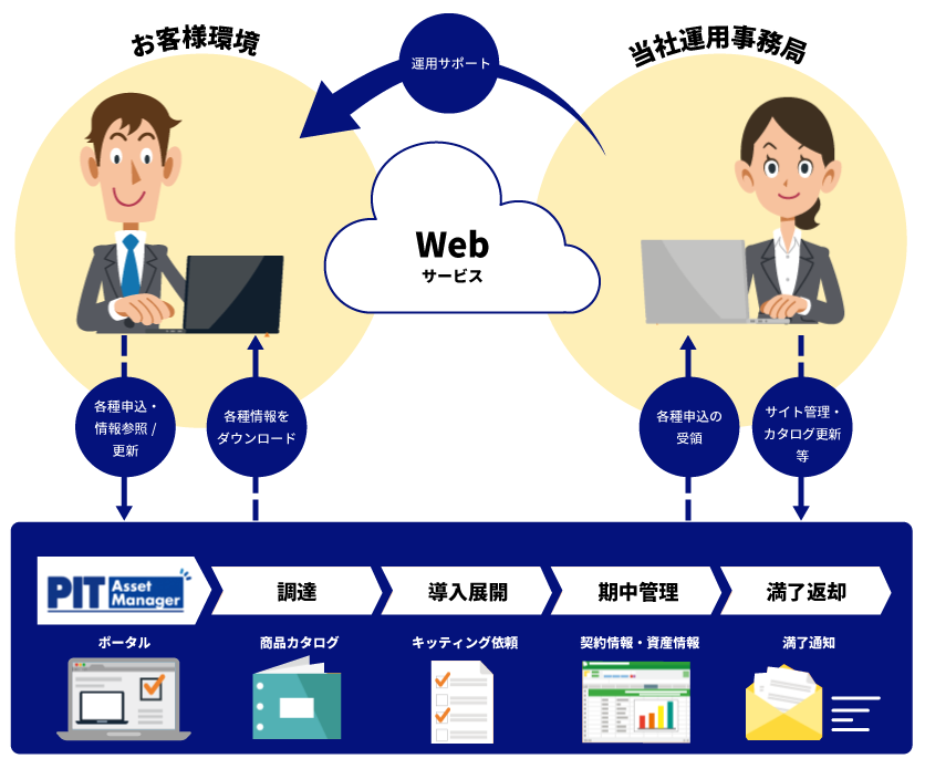 ICT資産の「調達・導入支援」「契約・資産管理」「運用管理」まで、お客様のライフサイクルにあわせたサービスをご提供いたします。ICT資産を有効活用できるよう、トータルでサポートします。