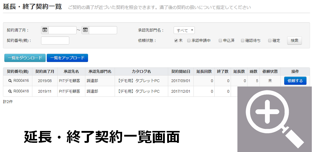 延長・終了の契約一覧表示から、延長または終了を選択し、延長・終了の手続きを行うことができます。